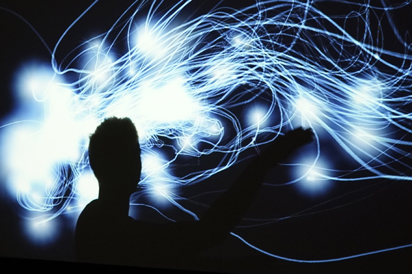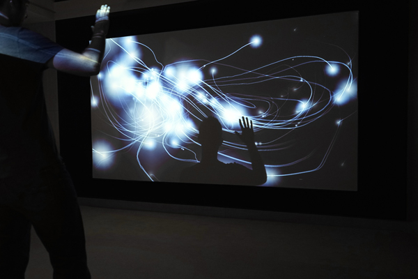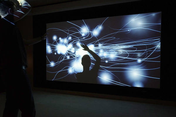 "...When a viewer standing in front of the screen takes a step or waves an arm, the swirling galaxy bursts into motion. The dots dive like comets, fanning out then regrouping, in response to the type and degree of human activity. Part celestial echo, part whimsical dance partner, the interactive projection is gently and thoroughly mesmerizing."
