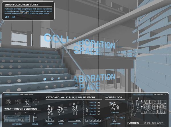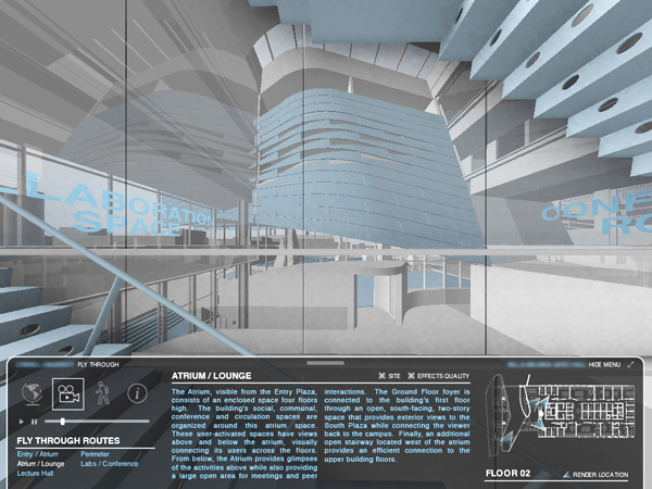 synthesis: bill & melinda gates hall web walkthrough, 2012 unity3D web app for cornell university by synthesis (marty doscher and john carpenter). model by thom mayne and morphosis architects. https://blogs.cornell.edu/gateshall/3dinteractive/