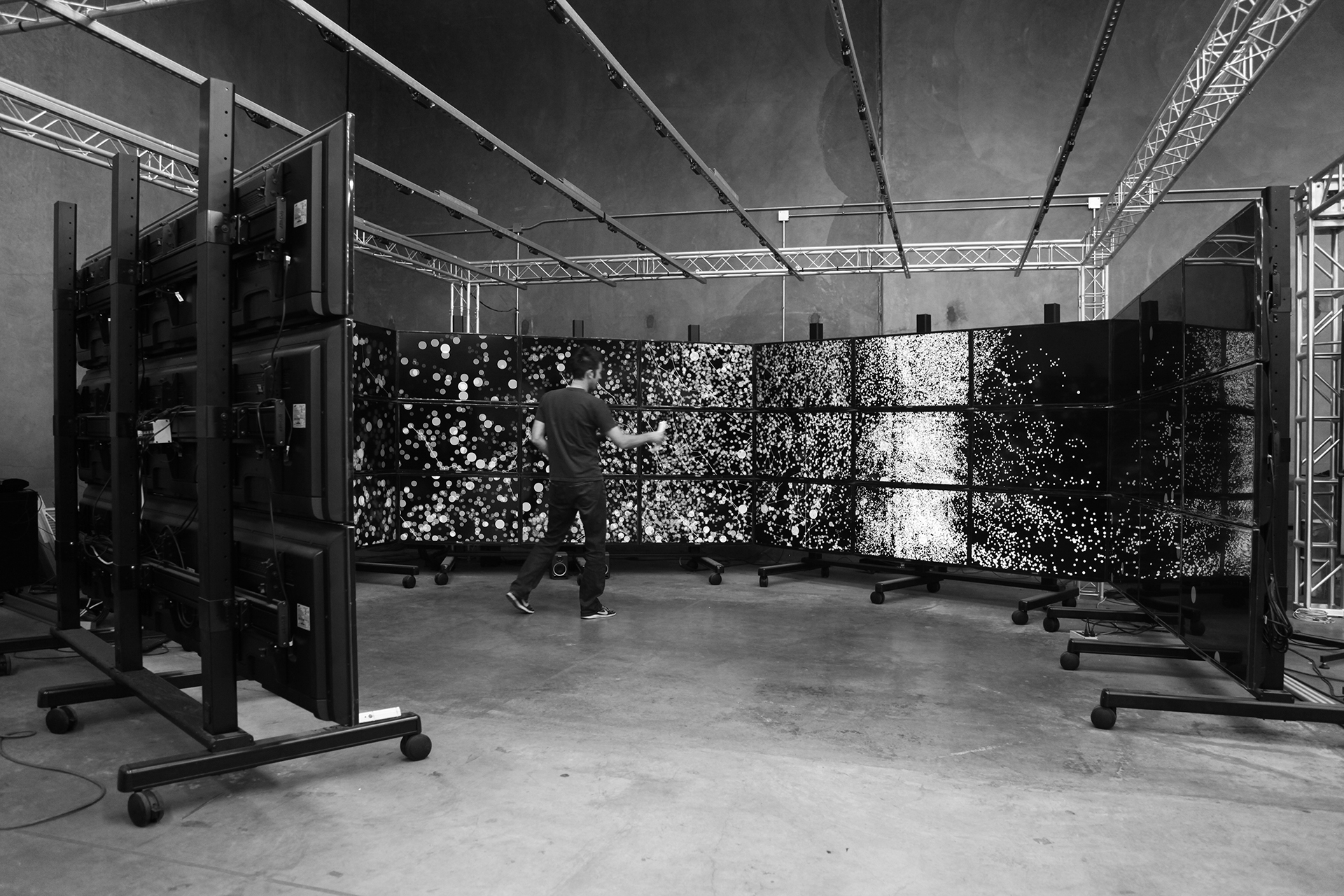 Using g-speak, Rusty and John designed a 320° immersive workspace that permits gesture-based navigation of volumetric image sets from early heart formation. The application runs in real-time on five computers over 45 screens (93,312,000 pixels), and the ultrasonic emitters and wand provide precise spatial interactions with the system. The raw data is multispectral 4D (xyzt) confocal microscopy image sets (11,088 images: 126 images every 7.5 minutes for 11 hours) that underwent quantitative analysis to generate a multi-dimensional data set for 460.6K points. The goal of the work was to enable the visualization of individual cell movements en masse while maintaining the integrity of the data and providing an intuitive new way to navigate and explore early cardiogenesis.