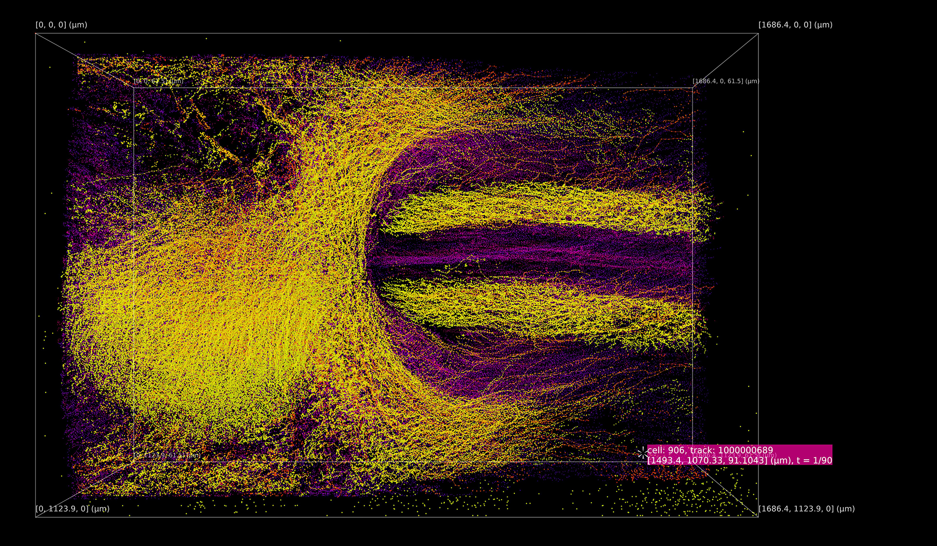There exists a critical need for new tools and techniques to visualize, filter, interpret, and share high-dimensional image datasets. New sensors allow scientists to collect such massive amounts of information from events such as cell migration in cardiogenesis that it can be difficult to perceive and understand all the hidden patterns and narratives using traditional visualization strategies. John Carpenter (Oblong and USC School of Cinematic Arts MA+P) and Dr. Rusty Lansford (USC Keck School of Medicine) demonstrate that immersive visualizations and spatial navigation can play an essential role in understanding complex multidimensional datasets.