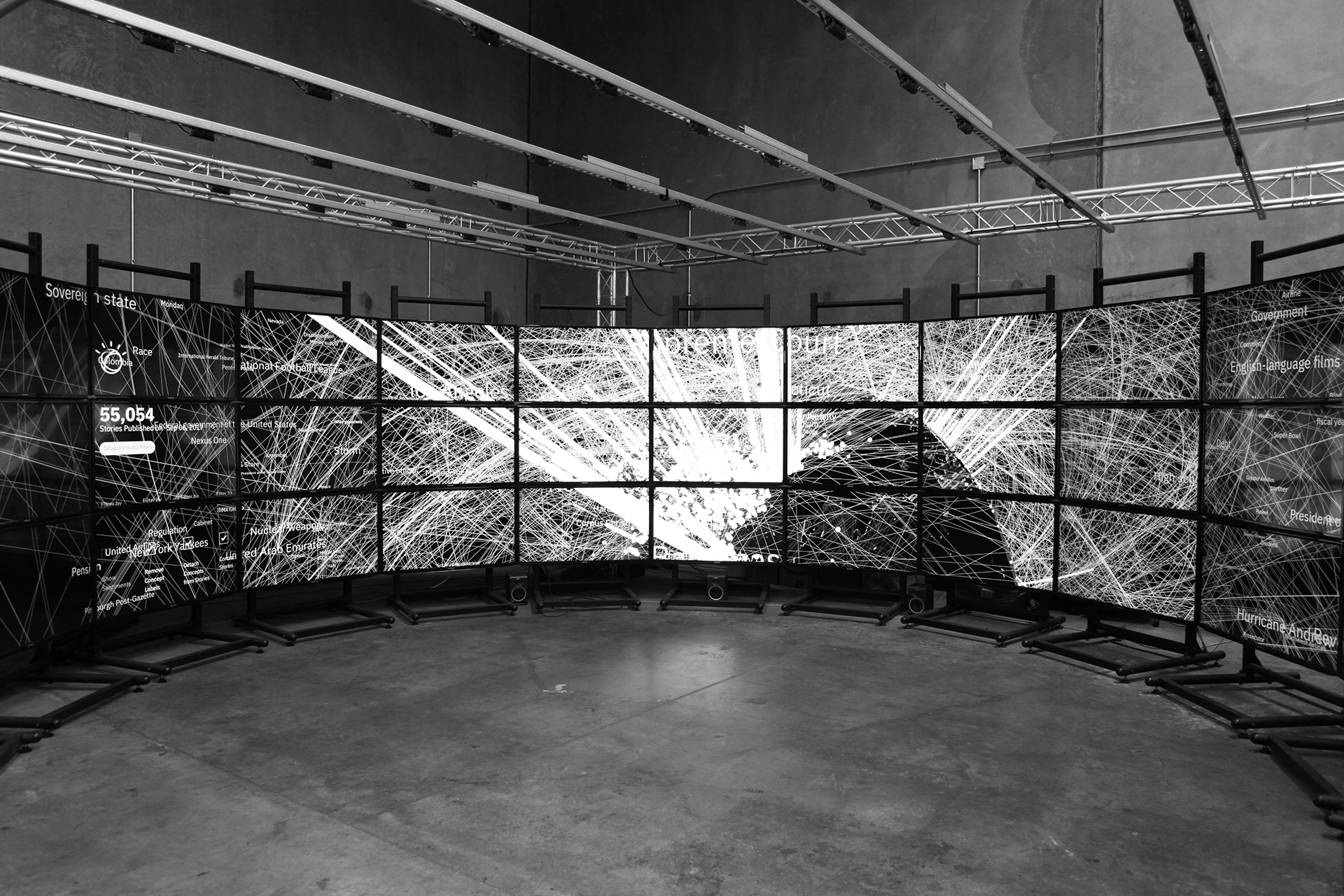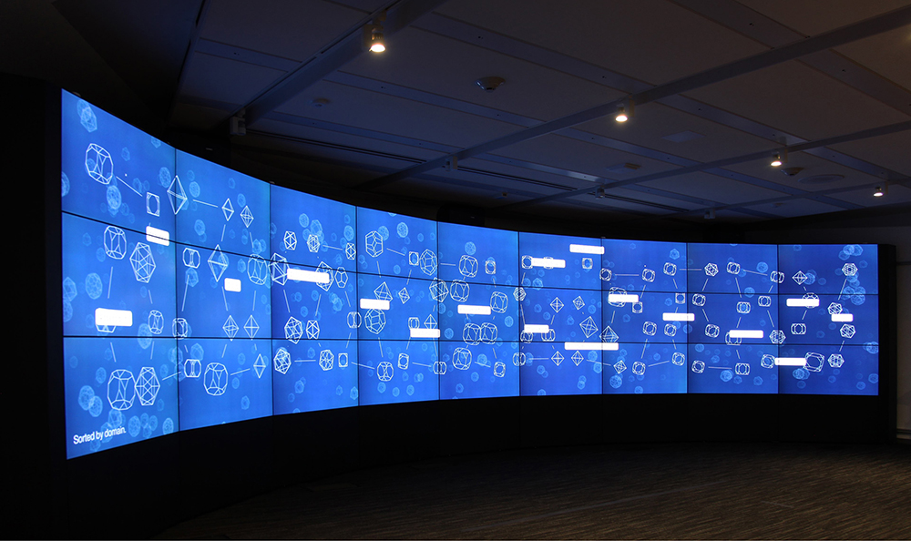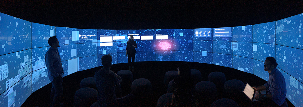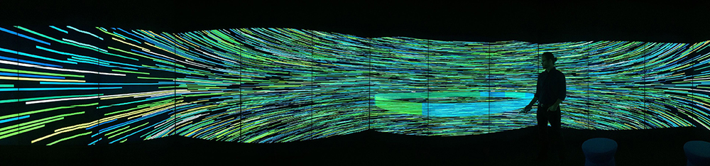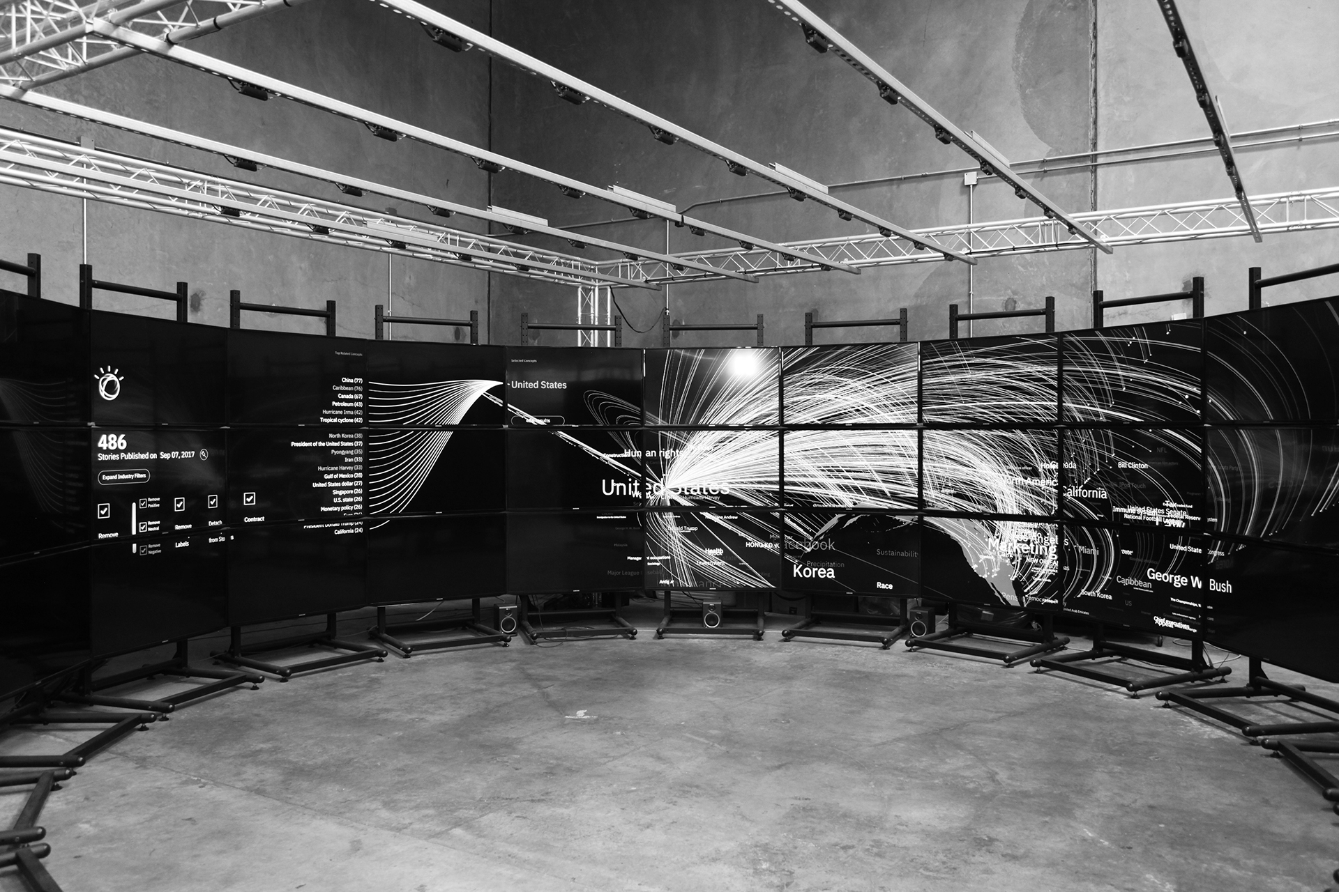 IBM Discovery News (2019): A collaboration with Jenny Woo (Design Lead of Watson Immersive Experiences at IBM) on a real-time, immersive, interactive data visualization for the Watson Discovery News service. The software is built in Oblong's g-speak spatial operating environment, and runs in real-time across 5 computers and 45 screens (93 million spatially and temporally synced pixels).