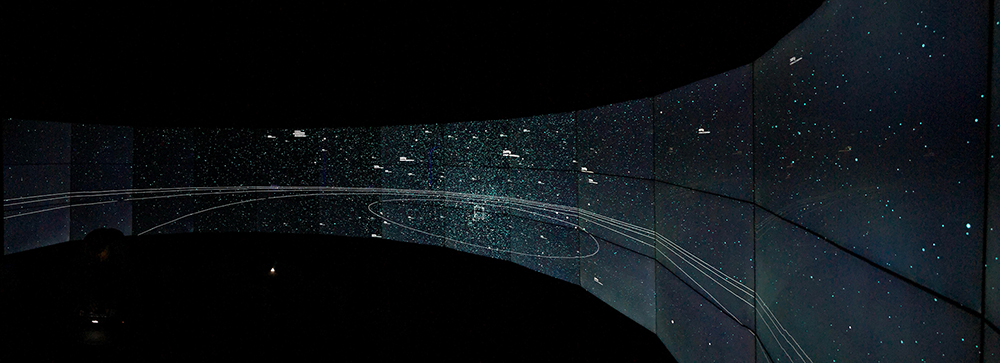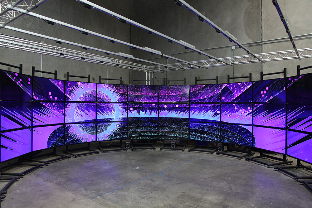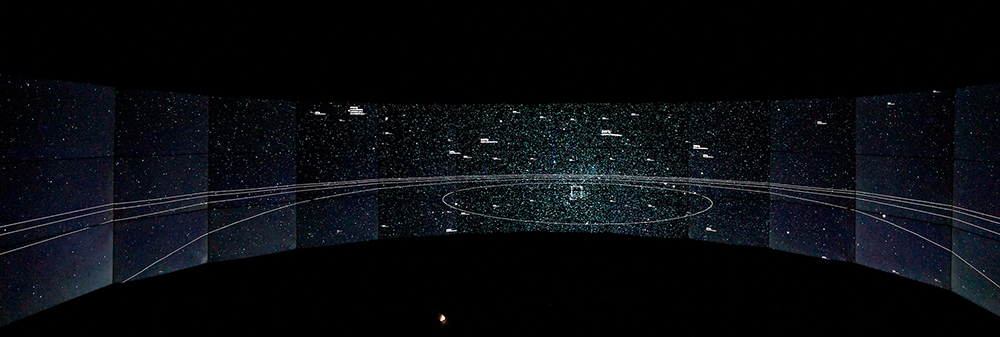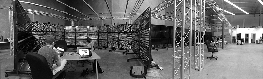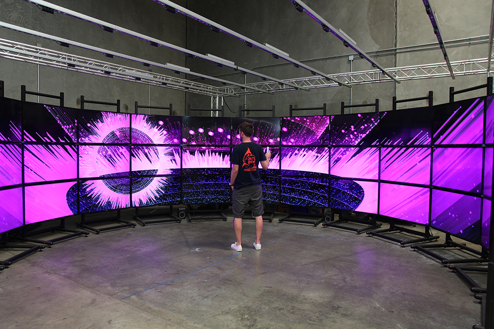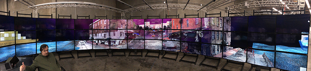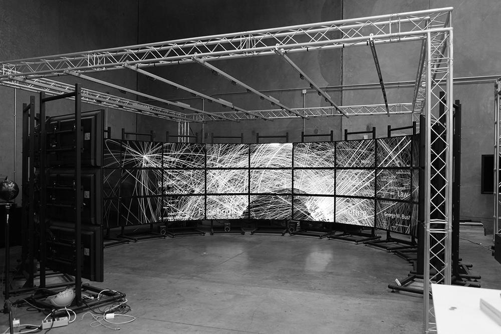 IBM Discovery News (2019): A collaboration with Jenny Woo (Design Lead of Watson Immersive Experiences at IBM) on a real-time, immersive, interactive data visualization for the Watson Discovery News service. The software is built in Oblong's g-speak spatial operating environment, and runs in real-time across 5 computers and 45 screens (93 million spatially and temporally synced pixels).