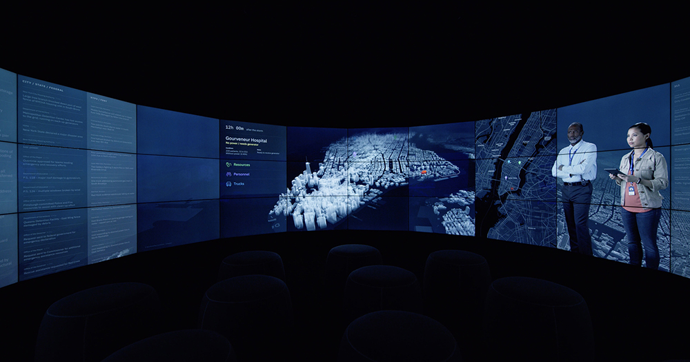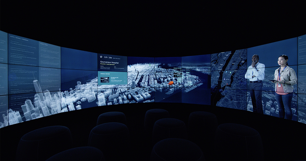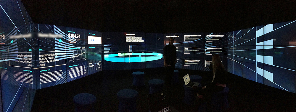At the heart of each IBM Watson Experience Center is an immersion room that surrounds its audience with 45 HD displays. That's 93.3 million pixels! Oblong has worked closely with IBM to develop new spatial visualizations and group interactions for these unique spaces, which host over 15,000 visitors every year.