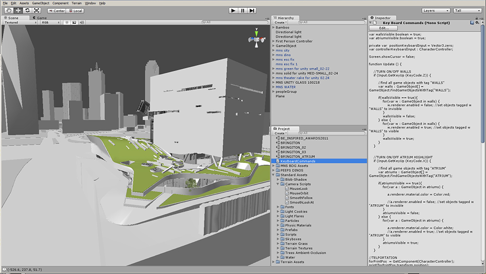 By ~2009, I became an integrated part of the design process working directly with Thom and the project teams to provide real-time visualizations of the architectural systems and complex geometries -- walkthroughs that allowed the architects and clients to get a sense of how the spaces would feel before they were built. The software was initially prototyped with Director and Processing, and ultimately built in Unity3D.