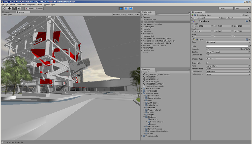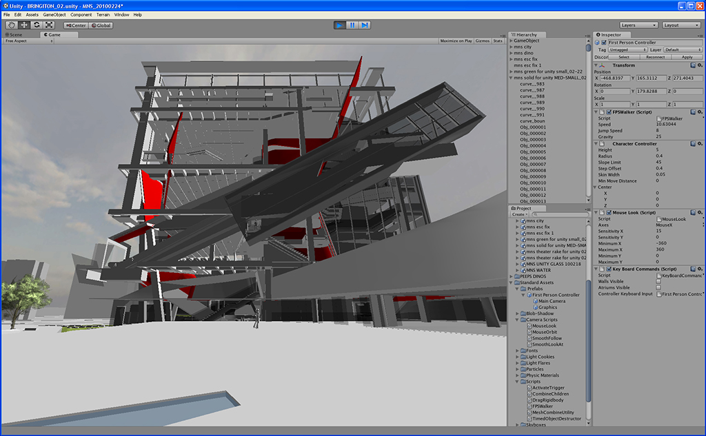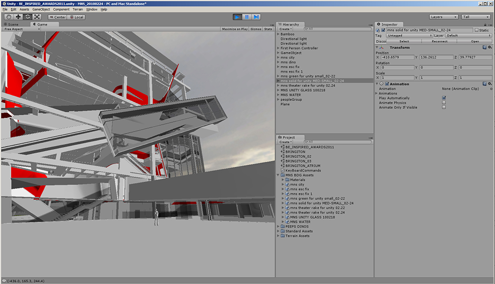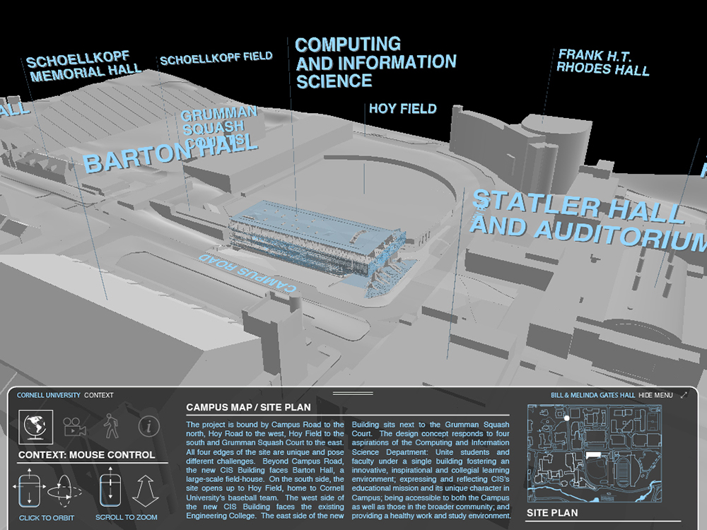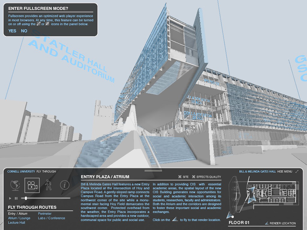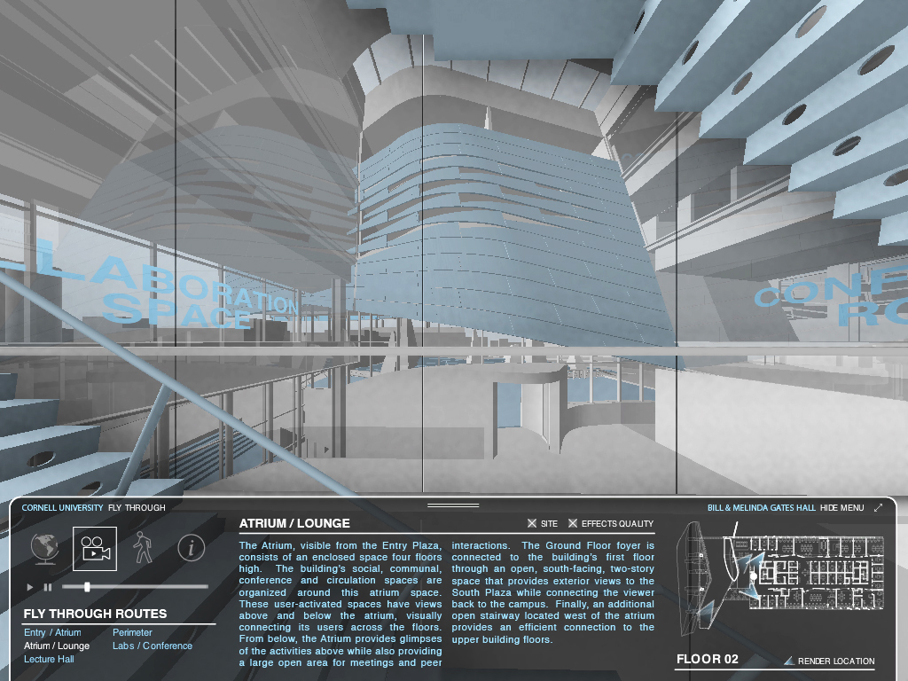 From 2011-12, Marty Doscher (currently the Vice President AEC Industry at Dassault Systemes) and I consulted with Morphosis and other architectural offices as Synthesis Technology Integration. While there we built Unity visualizations for clients including Cornell University -- where we produced a real-time, software-based, interactive walkthrough of the new Bill & Melinda Gates Hall for students and faculty.